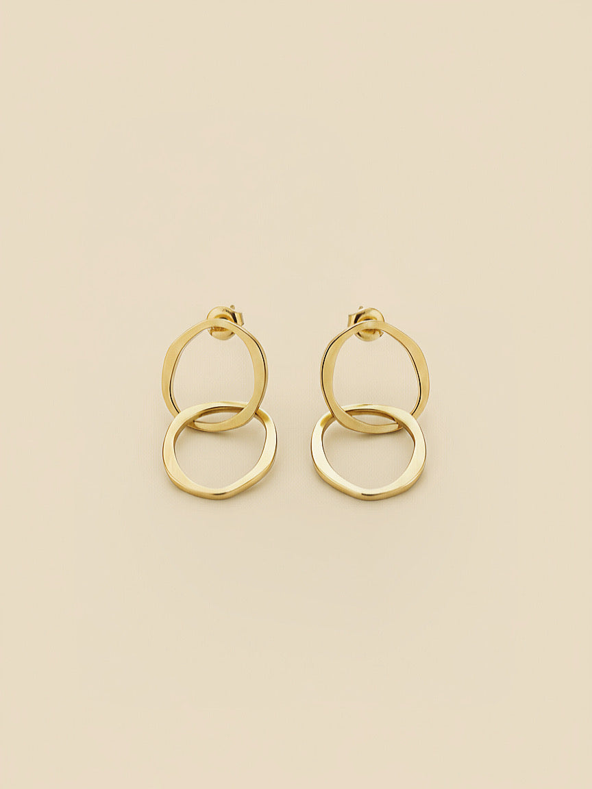 Due cerchi irregolari si intrecciano con naturale eleganza, fondendo l'anima artigianale delle forme imperfette con la lucentezza dell' acciaio inox placcato oro, creando un delicato gioco di movimento.